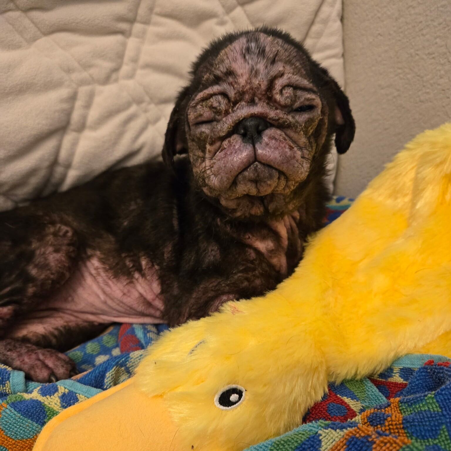 Fue uno de los casos más graves a los que tuvieron que hacer frente en los últimos años. Aunque tenía tan solo un año, era la muestra viva de la indiferencia. De raza pug, pesaba apenas 3,6 kg y su cuerpo estaba completamente sin pelo y en carne viva.