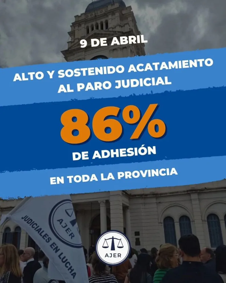 La Asociación de Judiciales de Entre Ríos (AJER) registró un 86% de acatamiento a la medida de fuerza, mediante la cual reiteró sus demandas de recomposición salarial y defensa del 82% móvil para jubilaciones.