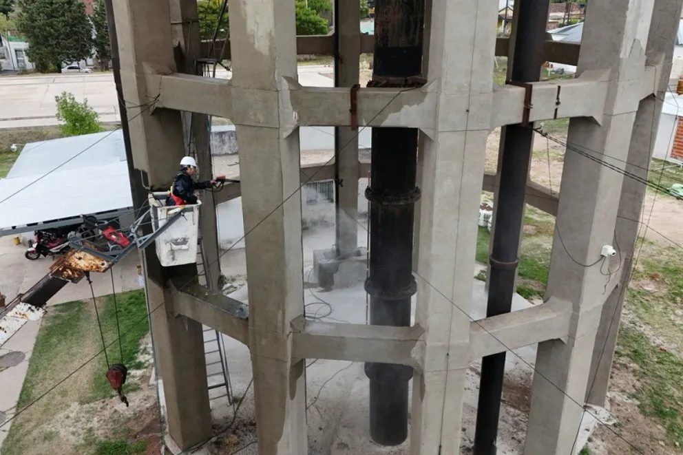 En etapas previas se realizó una limpieza profunda de la base, compuesta por doce columnas que sostienen la cuba. Estas fueron sometidas a hidrolavado para remover suciedad acumulada, líquenes y hongos presentes en la superficie. Posteriormente, se avanzó con la aplicación de pintura hasta el primer anillo estructural, mientras que el resto del tanque fue intervenido con trabajos en altura mediante el uso de grúas.